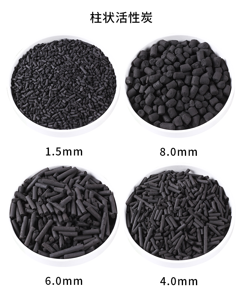 柱狀活性炭目視最容易判別的是外觀直徑及粒徑,常規(guī)產(chǎn)品分為:直徑1.5mm,3mm、4mm、5mm、6mm、8mm。 其中1.5mm柱狀活性炭在水處理方面以及防化面罩方面應(yīng)用的比較廣泛。3mm或4mm的柱狀活性炭在廢氣治理方面是應(yīng)用最廣泛的。8mm的柱狀活性炭作為脫硫脫硝活性炭應(yīng)用比較多。但是活性炭的應(yīng)用并不僅限于此,活性炭的應(yīng)用是廣泛且靈活的,可以根據(jù)實(shí)際不同的設(shè)計(jì)工藝,使用不同的活性炭規(guī)格。