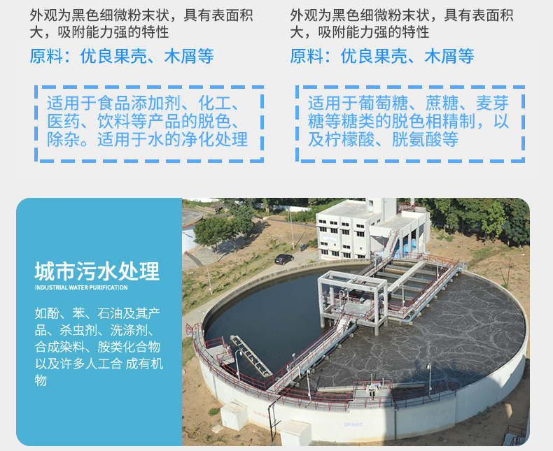2、液相吸附。木質(zhì)活性炭的灰分低、雜質(zhì)少、易提純,在食品飲料、醫(yī)藥等對吸附性能要求較高、產(chǎn)品要求較高的領(lǐng)域應(yīng)用廣泛。在污水深度處理中,木質(zhì)粉狀活性炭的應(yīng)用也十分普遍。