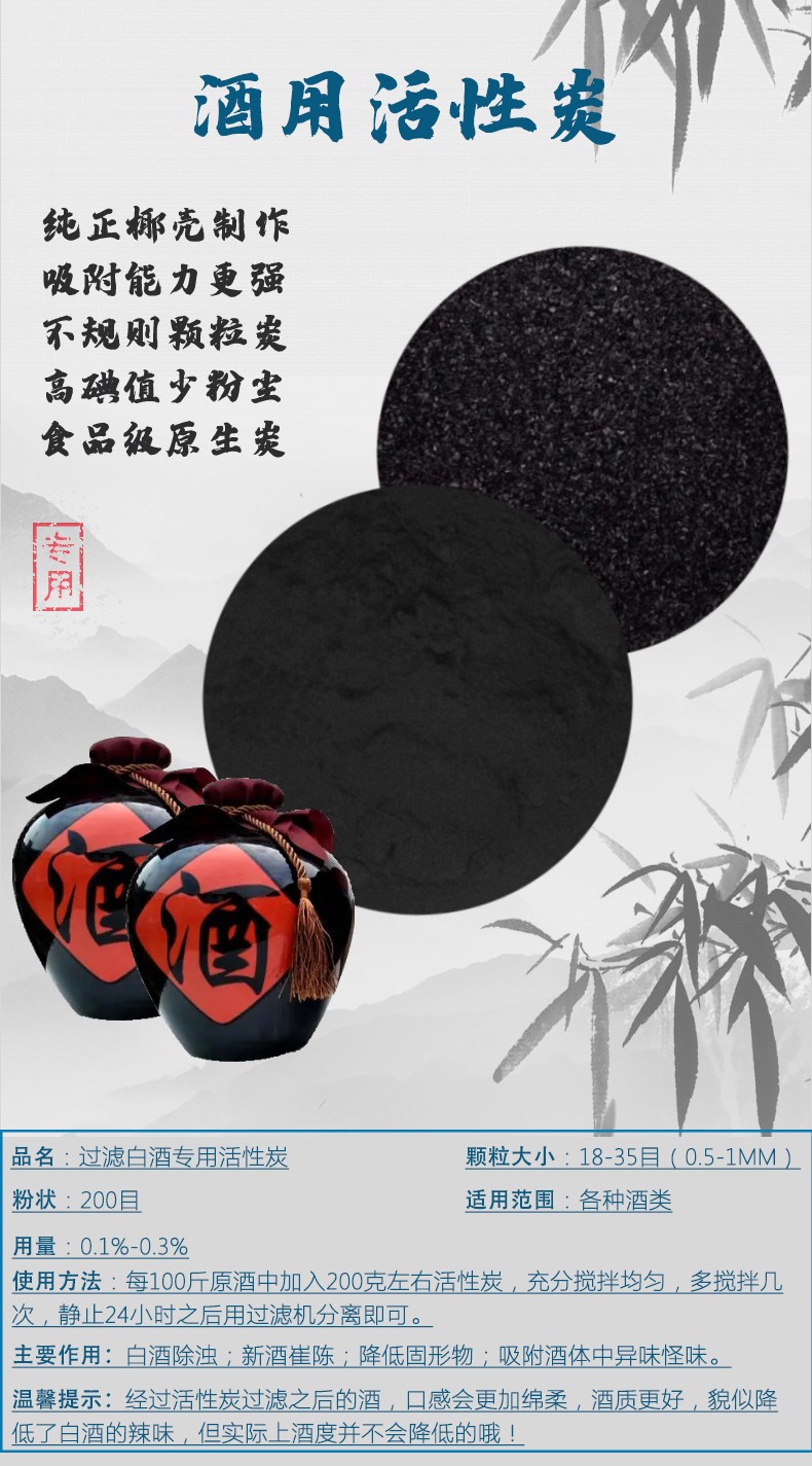 活性炭做為吸附劑,主要吸附白酒釀造程中產生的異味、異臭的雜醇油、糠醛、二甲基硫等有機物及醛類物質。并根據選用活性炭孔徑和處理時間、用量的不同吸附其中的大分子脂肪酸乙酯,加速水和乙醇分子的締合,從而預防酒在低溫下析出酸類乙酯,加速陳化,改善酒質。酒用活性炭用于酒類除濁、催陳,淺度異雜異味,防止高度酒低溫下復濁,白酒中的各種色素,酒類中的苦味物質,改善口感的作用。酒的釀造過程中會產生白色渾濁、失光、絮狀沉淀等問題。并且,當氣溫降低時,成品酒會出現白色絮狀懸浮物,嚴重影響酒的外觀和品質。活性炭用于酒的除臭精制,很好的解決了這些問題。那么活性炭能長期泡在酒里嗎?