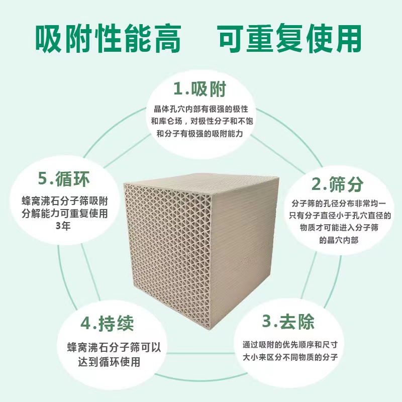 工作原理:蜂窩沸石分子篩主要基于其特別的微孔結構和表面性質。這些微孔結構使得分子篩能夠對不同大小、形狀和化學性質的分子進行選擇性吸附和過濾。當氣體或液體通過蜂窩沸石分子篩時,小于沸石孔徑的分子被吸附在沸石內部,而大于沸石孔徑的分子則被排除在外。這種篩分作用使得蜂窩沸石分子篩能夠實現對氣體和液體的凈化和分離。同時,蜂窩沸石分子篩的表面性質也可以通過不同的改性方法進行調節,以提高其吸附性能和催化性能。