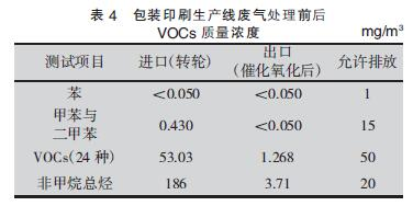 根據實際測量結果可知,沸石轉輪- 催化氧化裝置對大風量低質量濃度包裝印刷廢氣中VOCs 的去除效率高達98.01%,處理后的氣體符合允許排放質量濃度的要求。