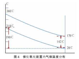 工況:入口氣體溫度T1=28 ℃,處理設備一次換熱氣體溫度T2=218 ℃,催化氧化后氣體溫度T3=360,廢氣余熱利用換熱后出口溫度T4=170 ℃。換熱溫度差值詳見圖4。