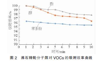圖2表明,對于包裝印刷行業廢氣中含有的VOCs物質(即苯系物、醇類與酯類物質),疏水性分子篩均能進行有效吸附。