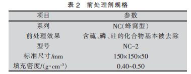 催化氧化分段裝置采用貴金屬Pt 作催化劑,對沸石轉輪處理后的高質量濃度廢氣進行預熱并將其催化氧化分解。其原理在于借助催化劑降低反應活化能, 使得氧化反應發生在較低的起燃溫度(250~400 ℃)。由于待處理廢氣中可能含有使催化劑中毒的物質(含硫、磷、硅等元素的化合物),因此需在前端設置預處理工序, 即采用陶瓷為載體的前處理劑(見表2)對使催化劑中毒的物質進行攔截。當進入催化劑室的高質量濃度廢氣溫度較低時, 可通過燃燒器對其進行預熱,使溫度上升至350 ℃;由于該溫度為氧化催化劑最佳活性溫度, 此時VOCs 的處理效率可達95%以上。